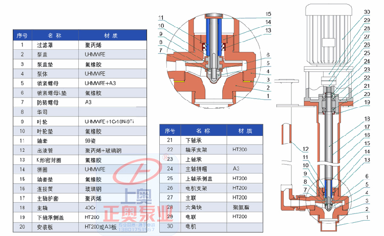 正奧公司生產(chǎn)的WSY型、FSY型兩種型式的泵,1.WSY型泵為立式玻璃鋼液下旋渦泵。2.FSY型泵為立式玻璃鋼液下離心泵,該泵因伸入貯罐,貯槽的深度長短不同,設(shè)計(jì)液下深度800mm~3000mm之間任意選擇。只要液體高于泵體,即可不灌液而起動(dòng)送液,平蓋板下設(shè)有泄漏孔,液體不會(huì)向貯罐外泄漏。本泵與介質(zhì)接觸的零部件,系用聚乙烯醇縮丁醛改性酚醛玻璃纖維,經(jīng)高溫模壓成型的酚醛玻璃鋼制件,聯(lián)接管、出液管采用半干法卷制工藝制成的酚醛玻璃鋼管,葉輪軸套的裝配均用酚醛膠泥和泵軸粘成一體,液下各部裝配均用酚醛膠泥粘結(jié),伸入液下全無金屬與介質(zhì)接觸,,產(chǎn)品具有輕質(zhì)、不變形、耐溫、耐腐蝕等優(yōu)良性能,在防腐方面可部分替代含鋁不銹鋼、鐵及鈦合金等貴重金屬。泵在傳動(dòng)和旋轉(zhuǎn)方向:泵通過爪型彈性聯(lián)軸器由電動(dòng)機(jī)直接驅(qū)動(dòng),從電動(dòng)機(jī)端看泵為順時(shí)針方向旋轉(zhuǎn)。