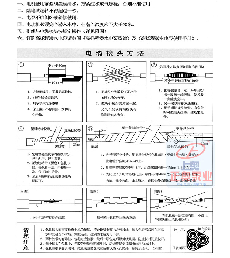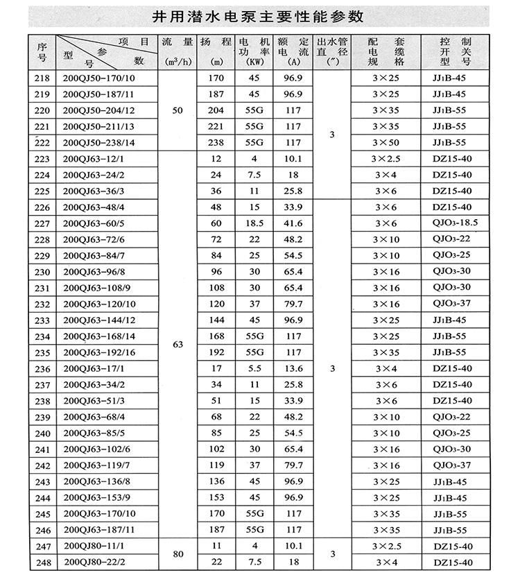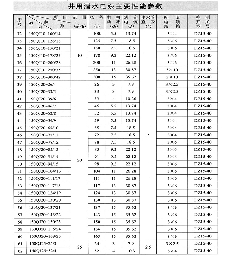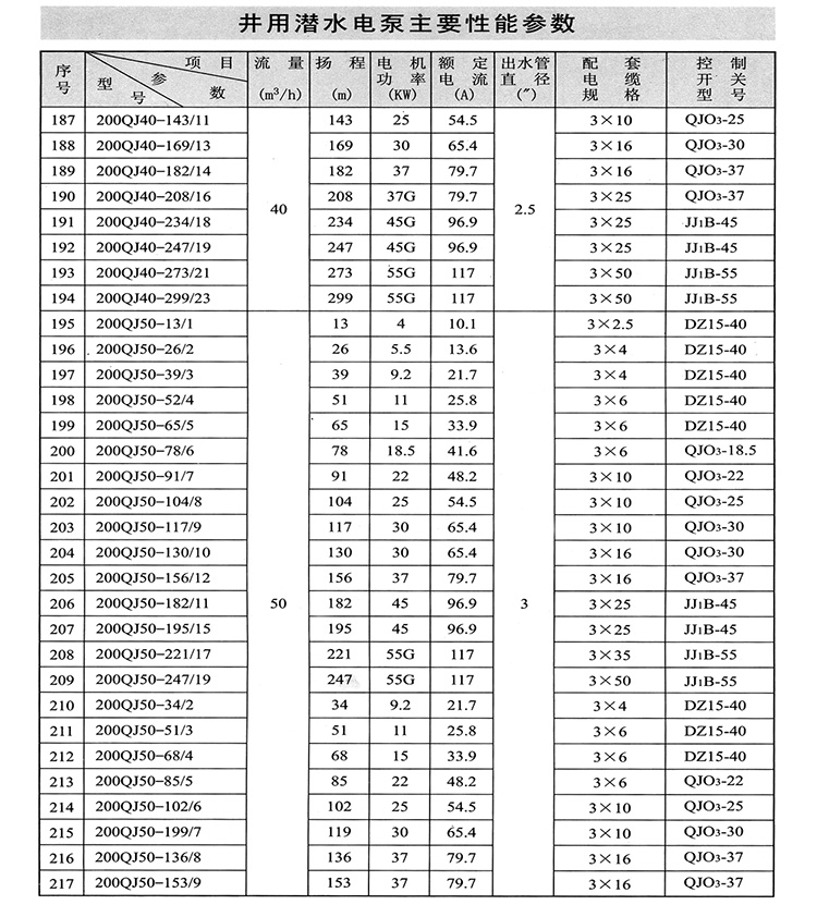 結(jié)構(gòu)說(shuō)明 1.QJ型潛水電泵機(jī)組由:水泵、潛水電機(jī)(包括電纜)、輸水管和控制開(kāi)關(guān)四大部分組成。潛水泵為單吸多級(jí)立式離心泵:潛水電機(jī)為密閉充水濕式、立式三相鼠籠異歩電動(dòng)機(jī),電機(jī)與水泵通過(guò)爪式或中.鍵筒式聯(lián)軸器直接;配備有不同規(guī)格的三芯電纜:起動(dòng)設(shè)備為不同容量等級(jí)的空氣開(kāi)關(guān)和自耦減壓起動(dòng)器、輸水管為不同直徑的鋼管制成,采用法蘭聯(lián)接,高揚(yáng)程電泵釆用閘閥控制。 2.潛水泵每級(jí)導(dǎo)流殼中裝有一個(gè)橡膠軸承;葉輪用錐形套固定在泵軸上:導(dǎo)流殼采用嫘紋或螺栓聯(lián)成一體。 3.高揚(yáng)程潛水泵上部裝有止回閥,避免停機(jī)水錘造成機(jī)組破壞。 4.潛水電機(jī)軸上部裝有迷宮式防砂器和兩個(gè)反向裝配的骨架油封,防止流砂進(jìn)入電機(jī)。 5.潛水電機(jī)采用水潤(rùn)滑軸承,下部裝有橡膠調(diào)壓膜、調(diào)壓彈簧,組成調(diào)壓室,調(diào)節(jié)由于溫度引起的壓力變化;電機(jī)繞組采用聚乙烯絕緣,尼龍護(hù)套耐水電磁線,電纜聯(lián)接方式按QJ型電纜接頭工藝, 把接頭絕緣脫去刮凈漆層,分別接好,焊接牢固,用生橡膠繞-層。再用防水粘膠帶纏2~3層,外面包上2〜3層防水膠布或用水膠粘結(jié)包一層橡膠帶(自行車?yán)锾ァ狄苑罎B水。 6.電機(jī)密閉,采用精密止口螺牷,電纜出口加膠塾進(jìn)行密封。 7.電機(jī)上端有一個(gè)注水孔,有一個(gè)放氣孔,卜部打個(gè)放水孔。 8.電機(jī)下部裝有上卜—止推軸承,止推軸承上有溝槽用干冷卻,和它對(duì)磨的是不銹鋼推力盤,承愛(ài)水泵的上廠軸向力。