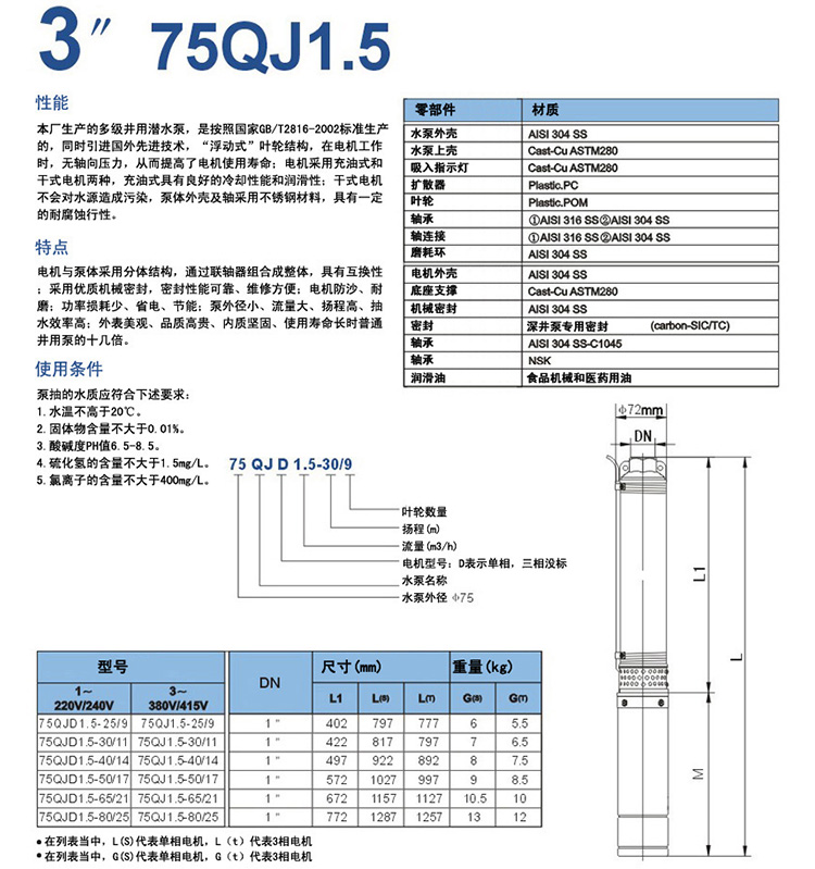 75QJ井用潛水泵產(chǎn)品選型: