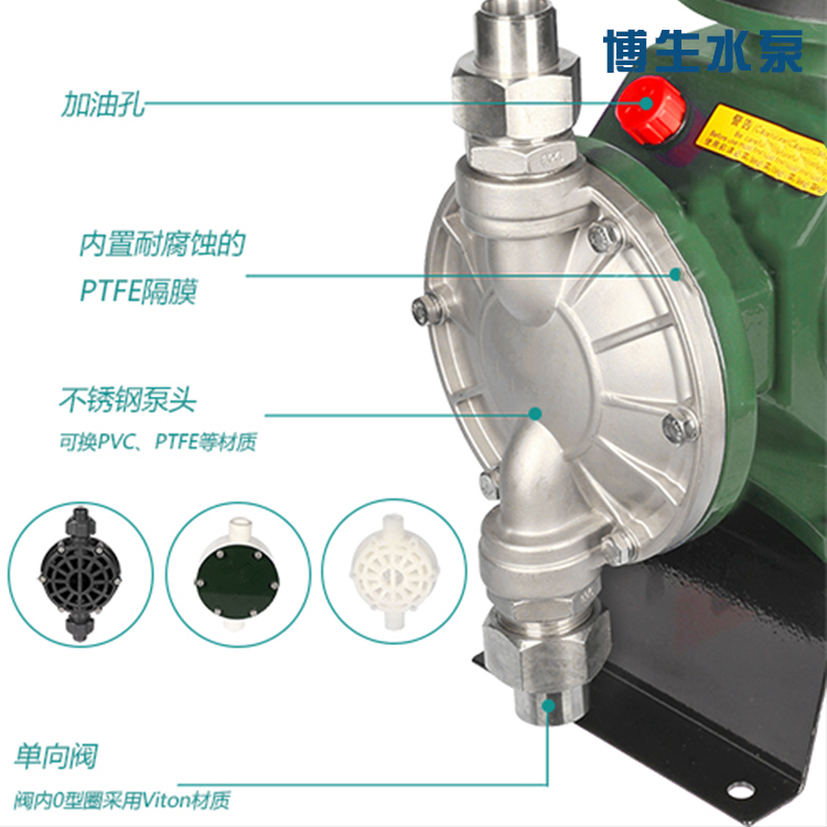 3、接觸介質(zhì)泵頭為PVC、可選PTFE、及不銹鋼材質(zhì)。