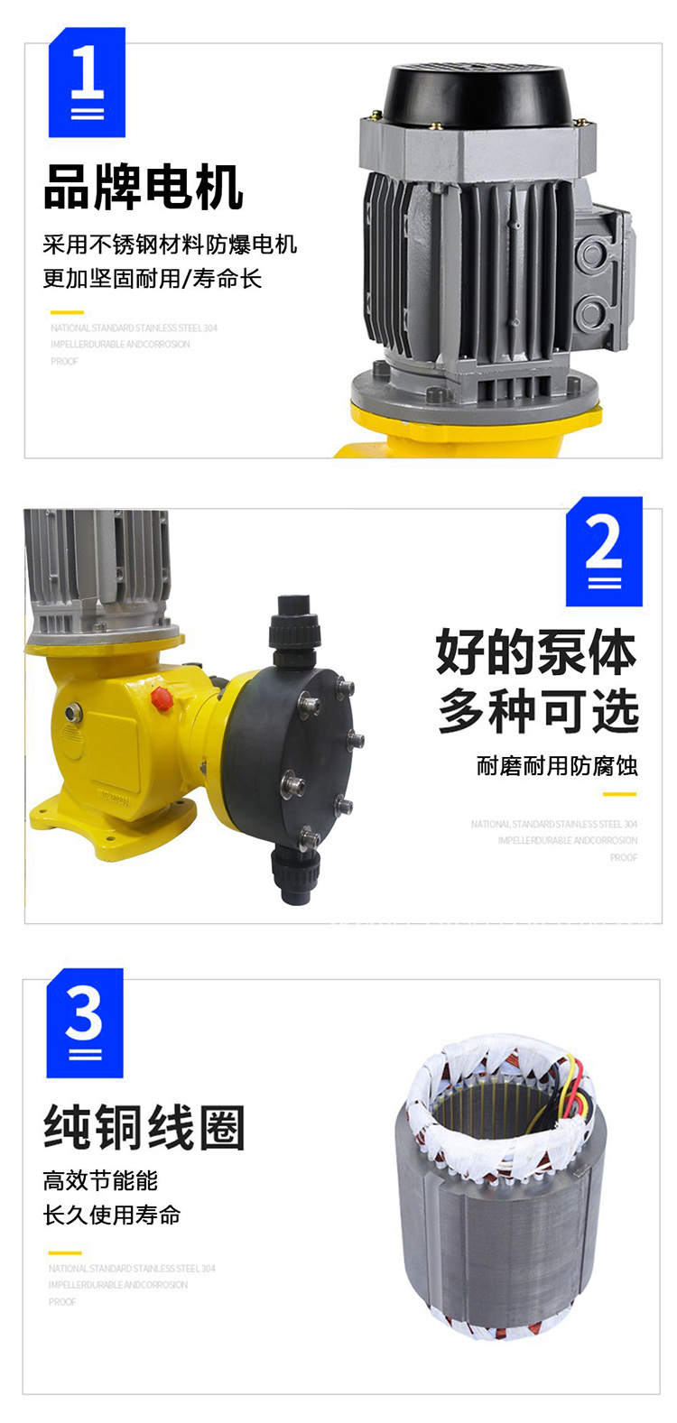 1、鑄鋁殼體,散熱性能高,整體重量輕,適用各種酸堿藥液,無毒無味。