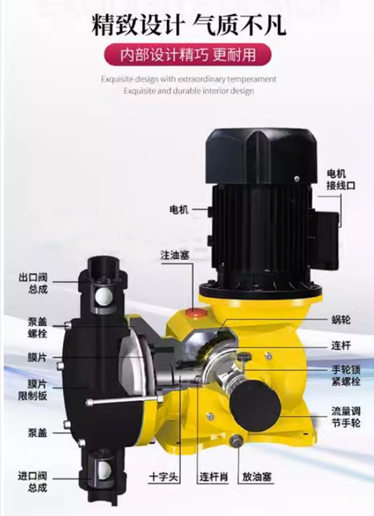 6、隔膜為多層復(fù)合結(jié)構(gòu)壓制而成,*層超韌性Teflon耐酸薄膜,第二層EPDM彈性橡膠,第三層厚度3.mm SUS304支撐鐵芯,第四層采用強化尼龍纖維補強,第五采用EPDM彈性橡膠完全包履,可有效提升隔膜使用壽命。 機械隔膜式計量泵應(yīng)用