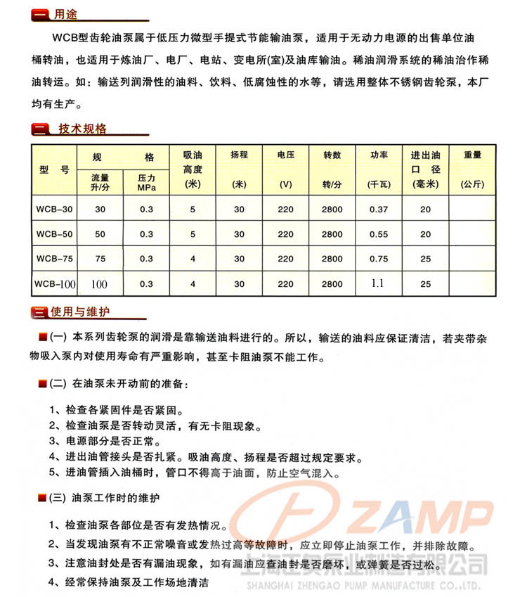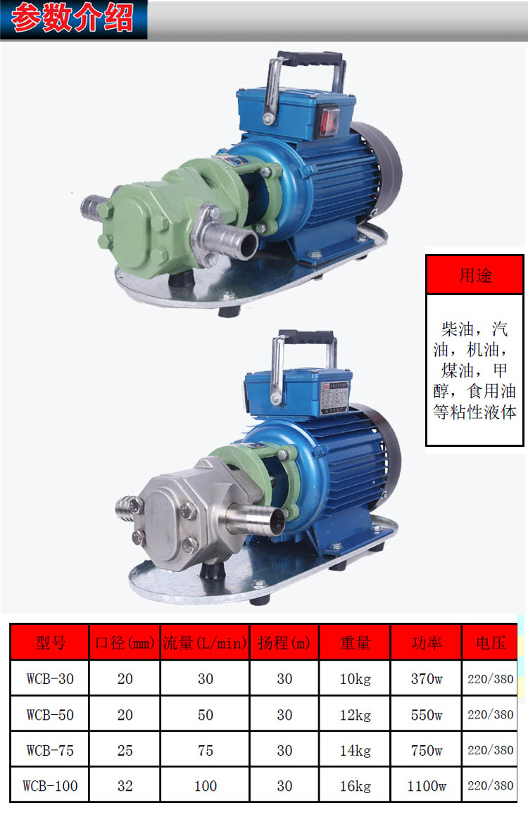 WCB型齒輪油泵屬于低壓力微型手提式輸油泵,適用于無動力電源的出售單位油桶車轉(zhuǎn)油,也適用于煉油、電、變電所(室)及油庫輸油。稀油潤滑系統(tǒng)的稀油治作稀油轉(zhuǎn)運。如:輸送無潤滑性的油料、飲料、低腐蝕性的水等,請選用整體不銹鋼齒輪泵,本均有生產(chǎn)。