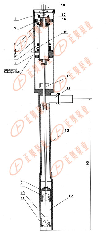 氣動漿料泵產(chǎn)品采用氣壓差的作用,使活塞上下運行,帶動導(dǎo)料活塞開閉,起到提料的作用。 具體裝置如圖(一)所示: 1、缸體 2、進氣閥 3、彈簧 4、彈簧 5、活塞 6、排氣管 7、換氣管 8、密封底座 9、密封上蓋 10、漿料缸體 11、進料口 12、漿料活塞 13、進料鋼球 14、鋼球 15、連桿 16、漿料管 17、出料口 18、加油閥 19、放氣閥