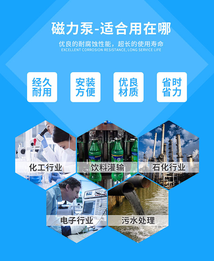 不銹鋼磁力泵結(jié)構(gòu)緊湊、外形美觀、體積小、噪音低、運行可靠、使用維修方便?蓮V泛應(yīng)用于化工、制藥、石油、電鍍、食品、電-影照相洗印、科研機構(gòu)、國防工業(yè)等單位抽送酸、堿液、油類、稀有貴重液、毒液、揮發(fā)性液體,以及循環(huán)水設(shè)備配套、過濾機配套。特別是漏、易燃、易爆液體的抽送,選用此泵則更為理想。