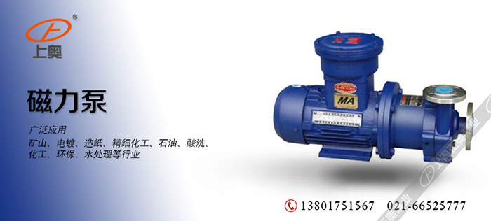 四、安裝和使用 1.磁力泵應(yīng)水平安裝,不宜豎立,塑料泵體不得承受管路重量,對于特殊要求垂直安裝的場合,電機務(wù)必朝上。 2.當(dāng)抽吸液面高于泵軸心線時,起動前打開吸入管道閥門即可,若抽吸液面低于泵軸收線時,管道需配備底閥。 3.泵使用前應(yīng)進行檢查,電機風(fēng)葉轉(zhuǎn)動要靈活,無卡住及異賞聲響,各緊固件要緊固。 4.檢查電機旋轉(zhuǎn)方向是否與磁力泵轉(zhuǎn)向標(biāo)記一致。 5.電機啟動后,緩慢打開排出閥,待泵進入正常工作狀態(tài)后,再將排出閥調(diào)到所需開度。 6.泵停止工作前,應(yīng)先關(guān)閉排出閥門,然后關(guān)閉吸入管閥門。五、使用注意事項 1.因磁力泵軸承的冷卻和潤滑是靠被輸送的介質(zhì),所以絕對禁止空運轉(zhuǎn),同時避免在工作中途停電后再啟動時所造成吋空載運轉(zhuǎn)。 2.被輸送介質(zhì)中,若含有固體顆粒,泵入口要加過濾網(wǎng):如含有鐵磁質(zhì)微粒.需加磁性過濾器。 3.泵在使用中環(huán)境溫度應(yīng)小于40℃ ,電機溫升不得超過75℃ 。 4.被輸送的介質(zhì)及其溫度應(yīng)在泵材允許范圍內(nèi)。工程塑料泵的使用溫度〈60℃,金屬泵的使用溫度〈100℃,輔送吸入壓力不大于0.2MPa,最大工作壓力1.6MPa、密度不大于1600^kg/m3,,粒度不大于30 X 10-6㎡/S的不含硬顆粒和纖維的液體。 5.對于輸送液為易沉淀結(jié)晶的介質(zhì),使用后應(yīng)及吋清洗,排凈泵內(nèi)積液。 6.磁力泵運行500小時后,應(yīng)拆檢軸承和端面動環(huán)的磨損惰況,若軸承和軸套的間隙大于0.5~1mm,葉輪軸向竄動1. 5~2mm時,應(yīng)更換軸承和軸向動環(huán)。