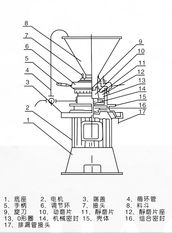 本產(chǎn)品配立式電動機,機體與電機連體同軸心結構,故又稱連體式膠體磨。
