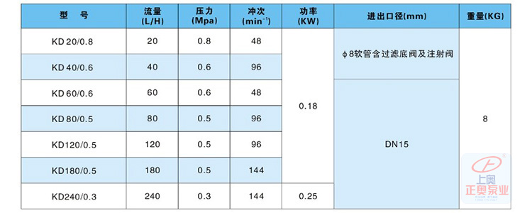 三、KD 隔膜系列計(jì)量泵技術(shù)參數(shù):
