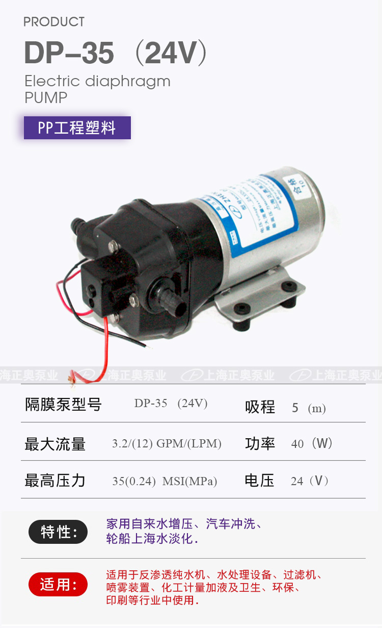 DP微型電動隔膜泵適用于家用自來水增壓、汽車沖洗、輪船上海水淡化,DP隔膜泵適用于反滲透純水機、水處理設備、過濾機、噴霧裝置、化工計量加液及衛(wèi)生、環(huán)保、印刷等行業(yè)中使用。