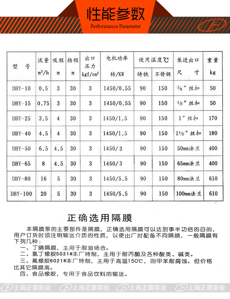 3、由于隔膜將被輸送介質(zhì)和傳動(dòng)機(jī)械件分開,所以介質(zhì)絕對(duì)不會(huì)向外泄漏;且泵本身無軸封,使用壽命大大延長;根據(jù)不同介質(zhì),隔膜可分為氯丁橡膠、氟橡膠、丁晴橡膠、聚四氟已烯、特氟龍(F46)等,可以滿足不同客戶的要求。