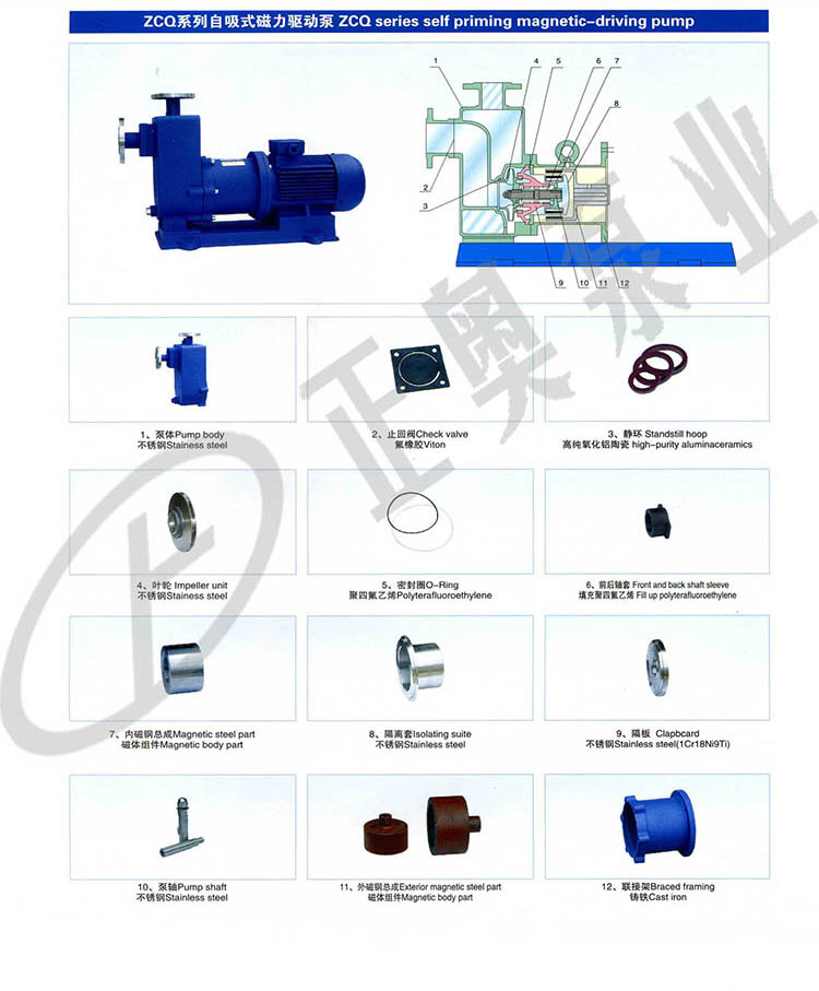 ZCQ系列自吸式磁力泵(以下簡稱自吸泵)是根據(jù)眾用戶的要求,該泵以靜密封取代動密封,使泵的過流部件處于完全密封狀態(tài),解決了其它泵機械密封無法避免的跑、冒、滴、漏之弊病,泵體及過流部件的材料均采用了耐腐蝕的不銹鋼、鋼玉陶瓷、四氟石器等材料制造,即有CQ型磁力驅(qū)動泵的功能,又集自吸于一身,不需底閥和引灌水、自吸高度4米。